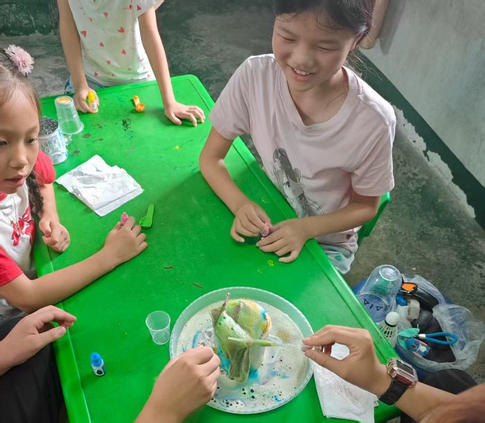 在地深耕:紧扣乡村生态痛点 《污水处理大师》课程精准锚定当地水资源保护需求。吉安乡村水资源珍贵,但孩童对水污染成因与治理认知空白。支教团结合在地实际,搭建由砂石、活性炭、棉花构成的简易过滤装置,将混有泥沙、颜料的模拟污水注入后,清澈液体逐层渗出。“污水真的变干净了!”孩子们凝视过滤后的清水,眼神中既有惊喜,更藏着对家乡河道的关切。