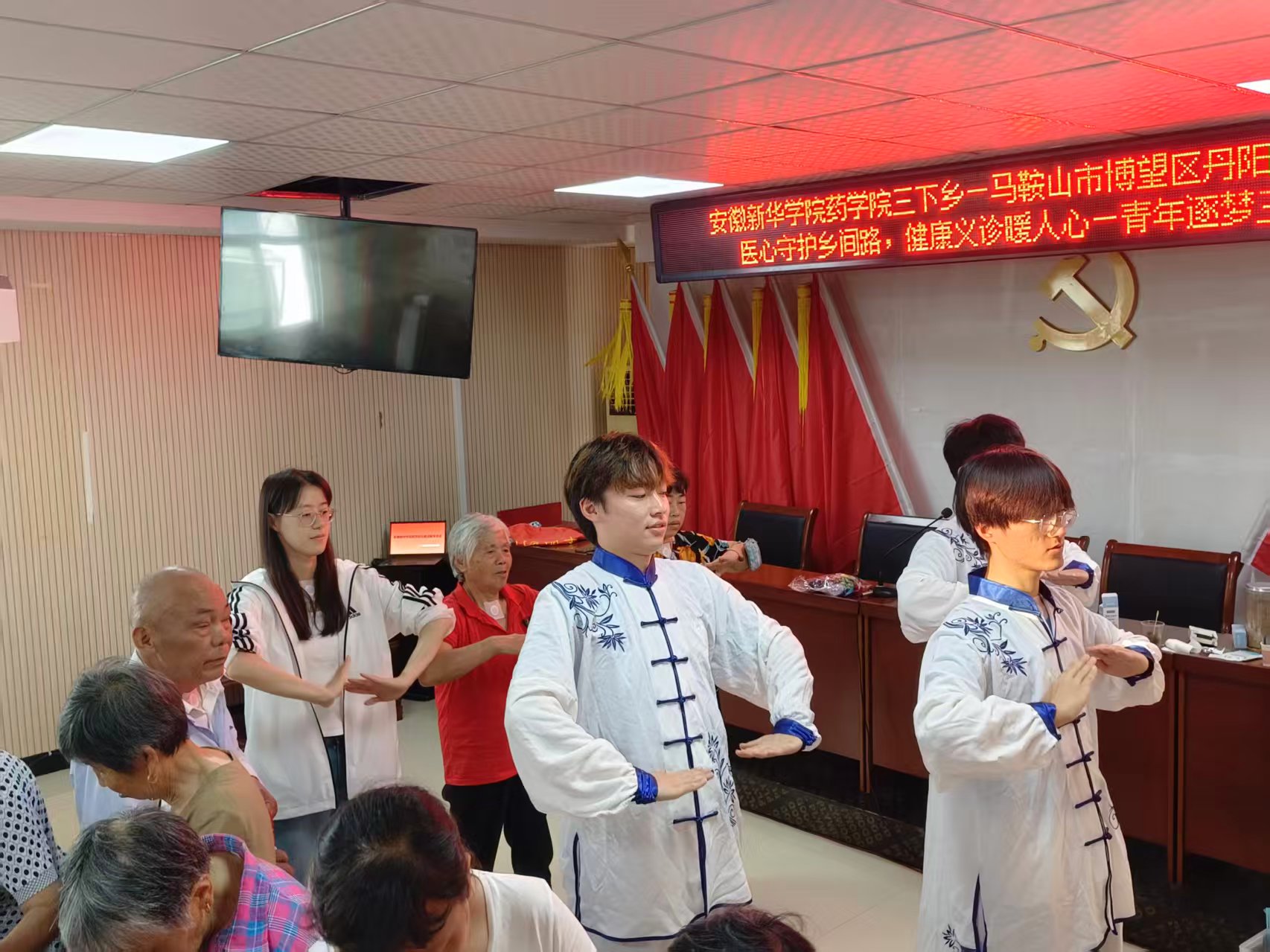 图为安徽新华学院药学院“华园药院青年实践团队”成员在百峰村村委会教村民学习五禽戏。刘宇琛 供图