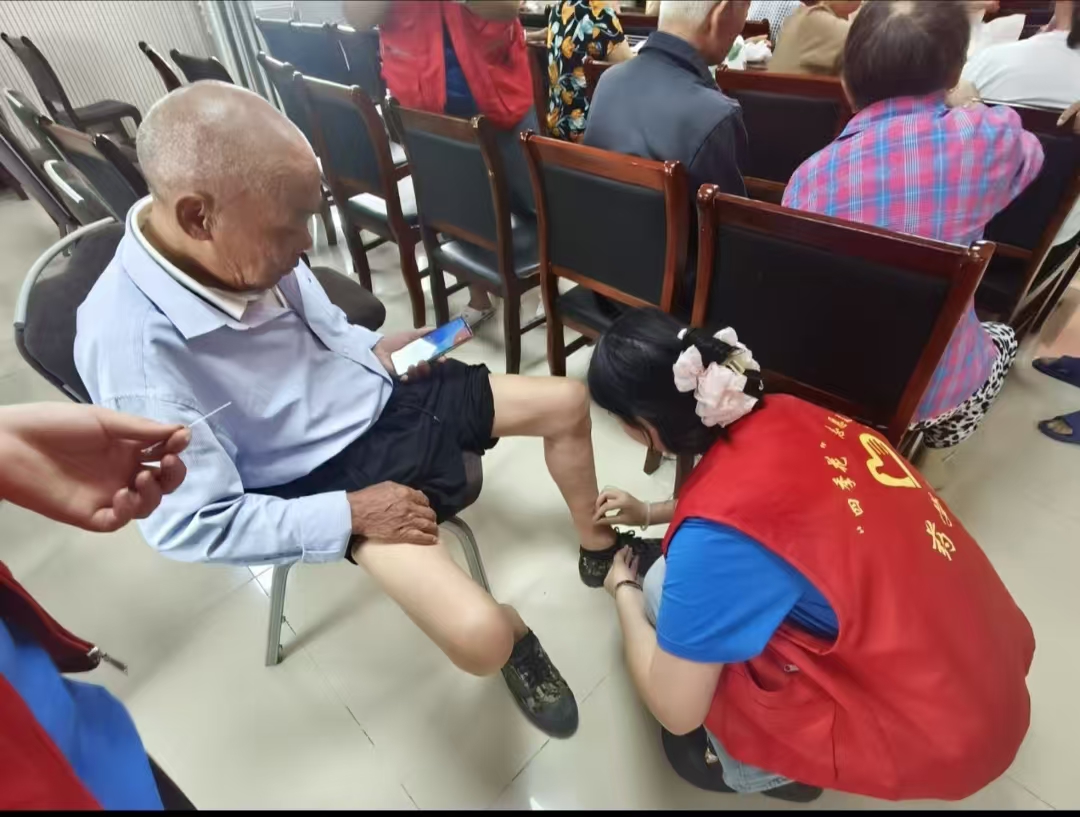 义诊惠民生,仁术暖人心 上午百峰村村委会义诊区刚布置完毕,便有村民陆续前来等候。实践队成员们迅速进入工作状态,各个端坐在诊桌前,耐心倾听每位村民的病情。“医生,我这肩膀疼得晚上都睡不好觉,您快给瞧瞧。”已经68岁高龄的周娟奶奶紧皱眉头,露出因长期劳作而僵硬的肩膀。李凌基见状伸出手指,沿着她的肩部经络仔细按压。凭借丰富的临床经验,精准定位到肩井、天宗等穴位,“这是典型的肩凝症,经络气血不通畅,咱们先针灸,再配合艾灸,能有效缓解疼痛。”消毒、进针、行针,李凌基手法娴熟而沉稳,每一个动作都严格遵循操作规范。“有没有酸胀感?”李老师轻声询问,在得到周娟奶奶肯定答复后,他继续微调针感,“这是得气的表现,说明治疗开始起效了。”实践队队员在一旁点燃艾条,将艾火悬于穴位上方,均匀地回旋施灸。温热的气息缓缓渗透进皮肤,周娟奶奶紧锁的眉头逐渐舒展:“舒服多了!这艾条一熏,肩膀像被太阳晒着似的,暖洋洋的。” 活动期间,华园药院实践团队累计为100余名村民提供健康咨询,以及针灸、艾灸等服务。