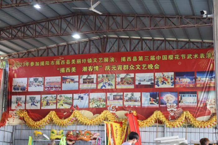 在塔头镇的街道旁,红墙亮眼的“揭阳市吴东松狮艺文化促进会”,是潮汕非遗传承的一方热血阵地。这里,藏着老板吴东松对英歌舞、狮艺的执着坚守。从热爱出发,这里不仅是英歌舞、武术、舞狮的传习所,更承载着潮汕人对非遗文化的深情。红墙之上,武术、英歌舞的宣传画,诉说着传承的故事,吸引着一批又一批热爱传统文化的人,在守护非遗的路上并肩前行。