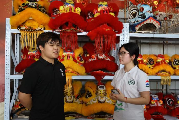 紧接着,舞狮登场。红黄醒狮先是轻快跳跃,身姿矫健如雀跃;随后狮尾稳稳托举狮头,顺势直立而起,狮头微微晃动,似在昂首眺望,简单动作里透着股机灵劲儿。这一摆一立,藏着舞狮传承人对祥瑞的期盼,也让舞狮这一传统民俗,在灵动表演里延续文化脉络。