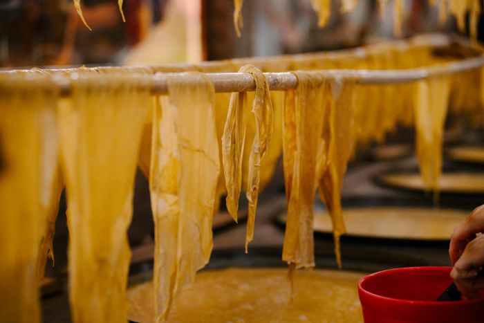 随后,成员们重点体验了精细的豆皮制作工艺。待豆浆微沸凝出薄如宣纸的表层后,在师傅指导下,成员们运用薄刃小刀沿锅沿轻旋分离豆皮,再以剪刀利落剪开,指尖轻提将其完整揭下,悬挂于竹架晾制。整个过程充分展现了传统手法的细腻与匠心温度。