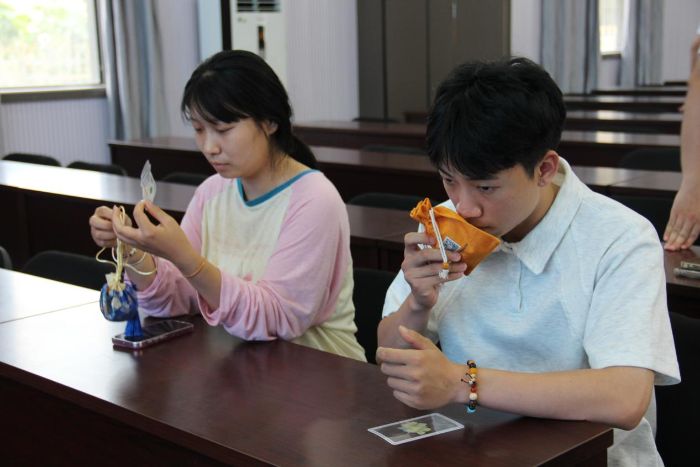 图为社区居民学习辨识香囊中的药材成分。陈玥摄