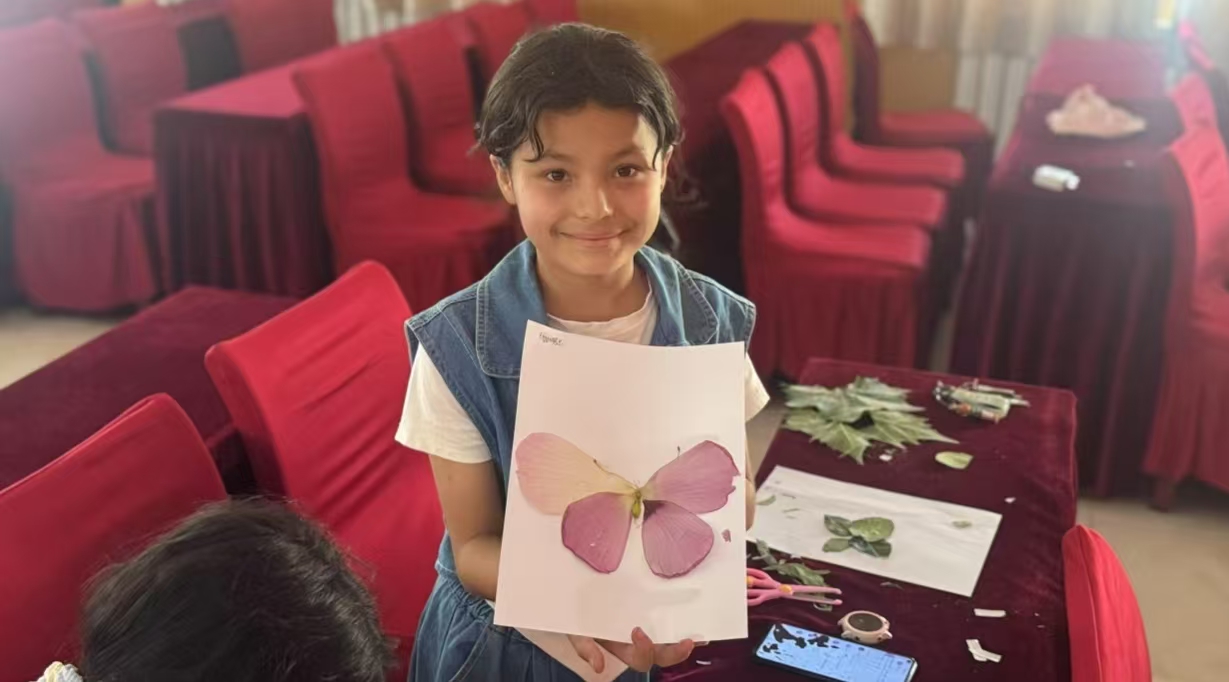 剪纸活动中,实践队员首先向小朋友们介绍了中国传统剪纸文化的历史和技艺特点。随后,团队成员手把手教小朋友们折叠纸,用剪刀剪出各种小图案。小朋友们充分发挥想象力,创作出了树木、蝴蝶等作品。活动最后,团队还带领小朋友们用前两天制作的植物标本进行创意设计,将干燥的植物标本拼贴成蝴蝶,小鹿等精美的自然画作。