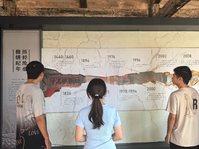 在参观报恩寺过程中,队员们还注意到了许多正在播放讲解的电子屏幕。在采访中问到关于在文化传承中对新媒体的尝试与规划方面,李诗嘉表示,文化传承的活力离不开青年力量,目前我们正以开放姿态推动合作,期待青年群体以创意赋能遗产保护,让青年智慧与历史遗产碰撞出更多火花。从数字化讲解到新媒体创新、青年实践,平武正以“数字化传播+年轻化参与”的模式,让历史文化在传承中焕发新生。