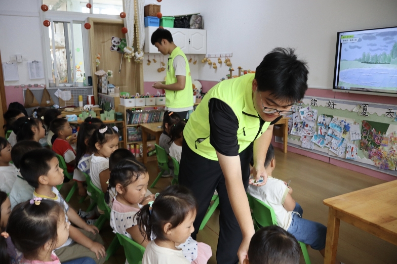 图为江苏科技大学海洋学院实践团成员在为小朋友分发环保主题贴纸。邹锦程 供图