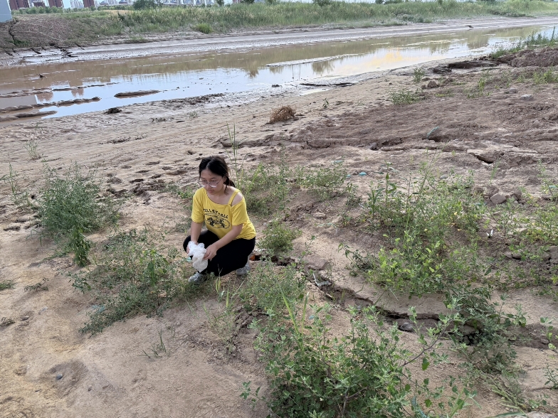 图为江苏科技大学海洋学院实践团成员在清理河滩垃圾。薛李媛 供图