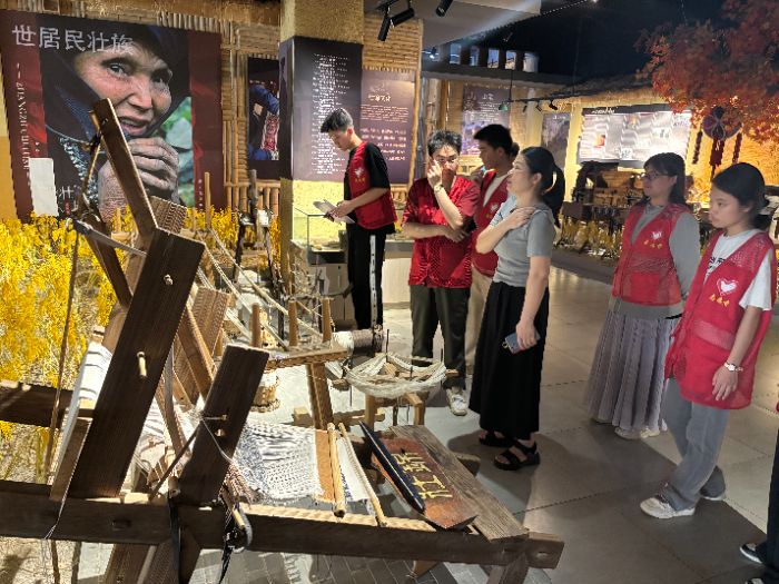 图为成员们参观壮族服饰织衣器具,工作人员介绍制作流程 朱凤汝 供图