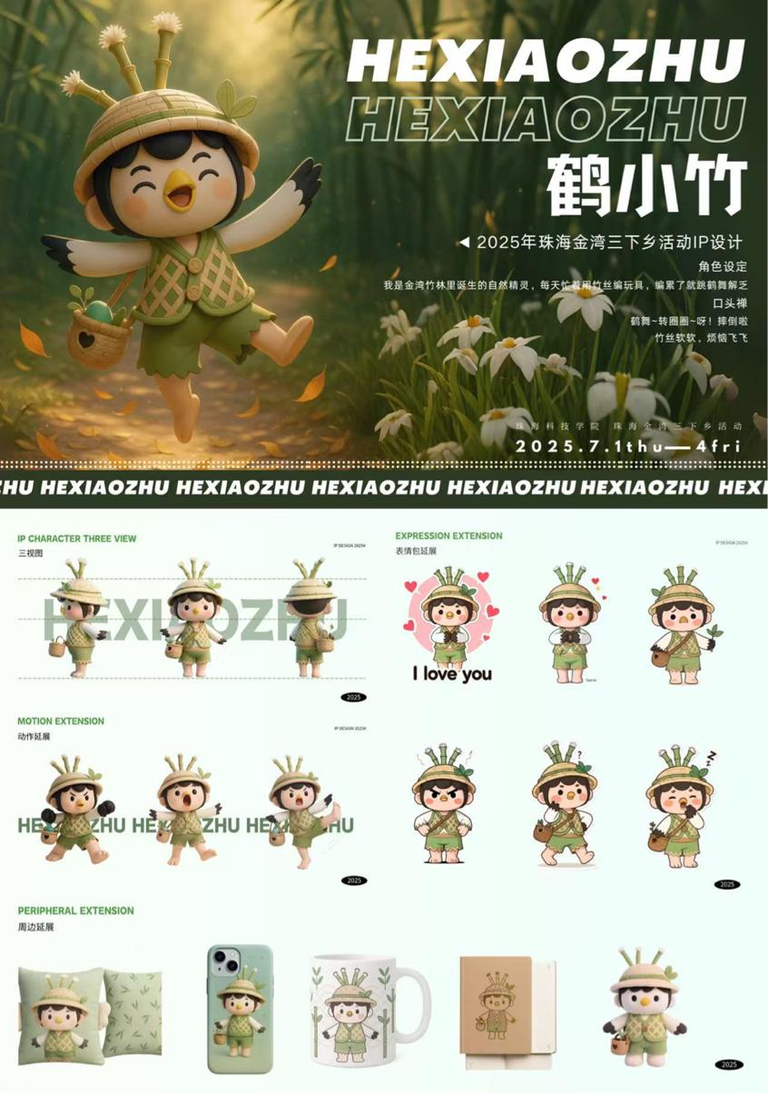 为助力海澄村文化传播,我们结合当地特色,设计了以三灶鹤舞为基础、融入竹编元素的卡通IP形象“鹤小竹”,旨在通过创新形式推广当地文化,为非遗传承注入年轻活力。
