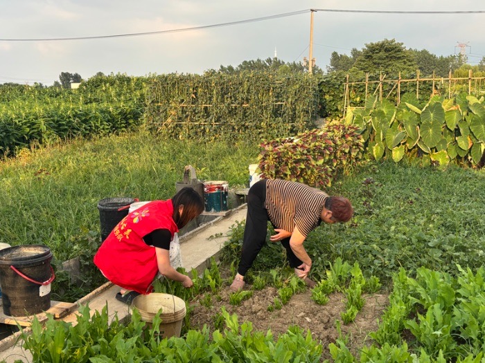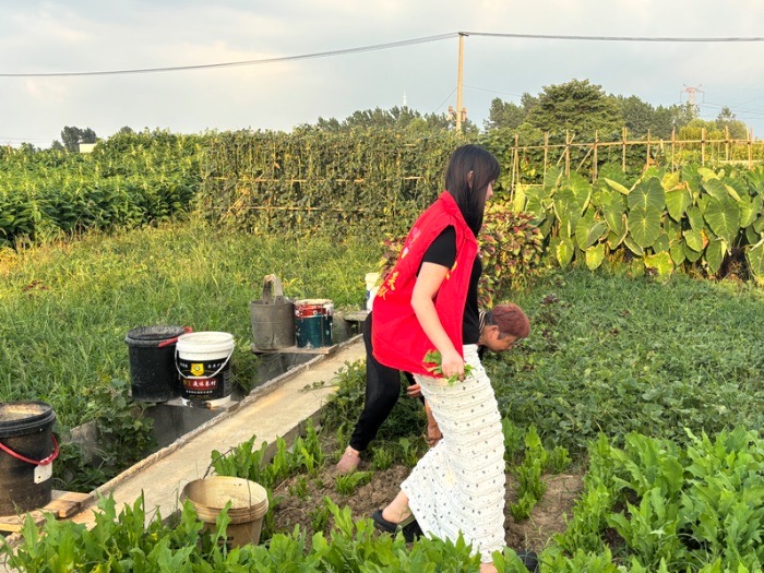 (成员周佳芮在农民的农作物田间除草,帮助农民务农)