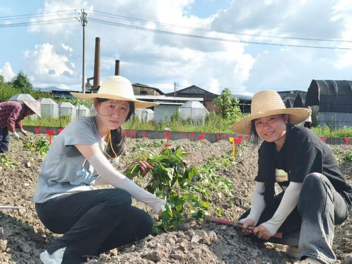 实践队队员刘晓佳和杜丽培正在种苗。陈羽摄
