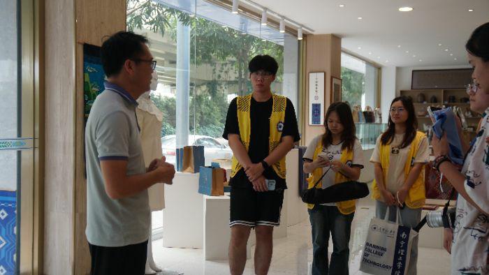 团队成员进入工美院中,“工美臻选”四个大字映入眼帘。展厅内,一幅幅壮锦文创作品错落陈列:有几何纹样,动物纹样子植物纹样织就的壁挂。也有融入文字的壮锦笔记本、帆布包。丝线穿梭在一代代传承人中形成了不同的文创产品。队员们驻足细看,用指尖抚摸着不同的壮锦织布,仔细聆听周厂长细数壮锦不同时期的发展历史:壮锦的发展源头可追溯到六千年以前的新石器时代,百越文化遗址有陶纺轮出土,壮族先民很早就已经学会了纺织,汉代逐步发展,唐代被列为贡品,在唐代壮锦织布的技艺已经有了一定的成熟。由之前唐宋时期的的壮锦极为难得,到如今,壮锦通过文创设计走进千家百户的蜕变可见壮锦从古至今,一直在发展传承。