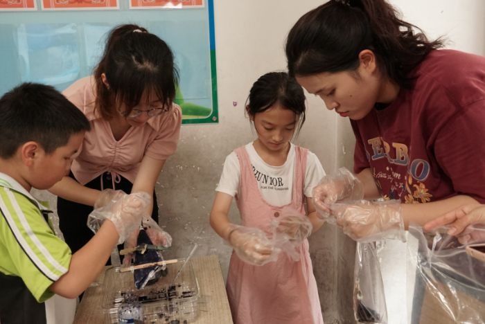 诗歌课堂上,团队成员化身文化使者,以妙趣横生的讲解引领孩子们畅游诗歌海洋,点燃他们对文学的热爱;书法课堂墨香氤氲,孩子们在团队成员的悉心指导下专注书写,于横竖撇捺间感受传统文化的深厚底蕴。漆扇制作、扎染体验等非遗工艺课程更是别开生面,孩子们化身传承者与创造者,亲手触摸传统技艺,在动手实践中让文化在指尖传承、心中扎根。这些沾着墨迹、染着靛蓝的小手,正托起文化传承的希望,让千年文脉在乡村沃土上续写新篇。