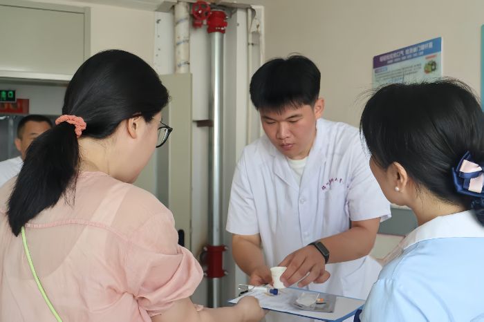 在肺功能检查室,经验丰富的金护士长详细讲解了儿童肺功能检查的设备原理与操作流程。从如何指导孩子配合吹气,到如何解读检测数据,再到不同年龄段儿童的指标差异,金护士长将多年的临床经验倾囊相授。她还为“准护士们”详细讲解了儿科门诊的日常工作流程,并分享了儿童疾病的季节性规律:“春秋季呼吸道疾病高发,夏季则要特别警惕肠道传染病。”金护士长特别叮嘱道:“面对小患者,三分靠技术,七分靠沟通,要学会用孩子能理解的语言解释治疗过程,用家长能接受的方式传递关怀与温暖。”同学们边听边认真记录,在提问互动与深入交流中,不仅收获了宝贵的专业知识,更真切地感受到了护理前辈们以患者为中心的从业初心和精益求精的职业精神。