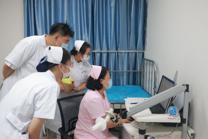 如果说儿科门诊让同学们感受到了护理工作的温度,那么在健康管理中心的实践则让大家触摸到了护理工作的广度。在杨夙护士长的带教下,同学们在实践中深化了对健康管理的理解。在各个检查室,同学们从最初的“手足无措”到后来的“熟练操作”,这一过程充满了挑战与成长。护士前辈们不仅详细讲解了各项仪器设备的检测原理与操作规范,更结合自身经历与同学们聊起护理学专业的发展前景:“你们要趁年轻多学技能,未来才能适应多元化的岗位需求。”这些谆谆教诲让同学们深受触动,大家对未来的职业道路都有了更加清晰的认识和规划。