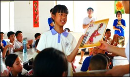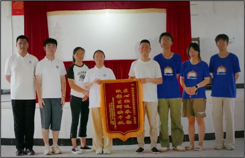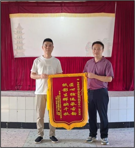 在活动的尾声,怀着对传统文化守护者的崇高敬意,支教团队长高心玲代表团队向朱龙老师敬献锦旗——“匠心独运承古韵,纸影生辉映千秋”,感念其传承非遗的执着坚守。