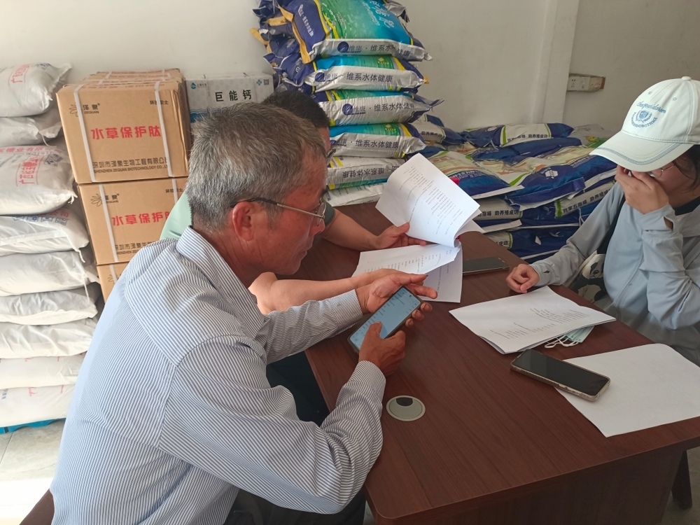 剩下的时间里,团队成员三两一组与村民、蟹农及批发商们展开交流对话。在与村民们的交谈中,成员们了解到如今的阳澄湖大闸蟹实际上并非直接养殖在阳澄湖中,而是借调湖水在养殖基地的蟹塘进行培育,“那个螃蟹的排泄物是很脏的,那水源就被污染了。”在消泾村养蟹业不断发展壮大的同时,蟹农们也在绿色发展理念指引下开拓出更科学、更绿色的养殖方式,实现传统养蟹的转型。