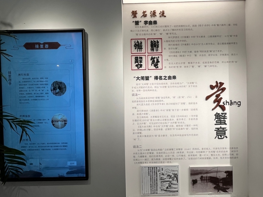 随后,团队成员分别去往村大闸蟹文化馆及消泾村的阳澄湖地区抗日斗争史迹陈列馆。消泾村的大闸蟹文化馆以“蟹”为主题,通过沉浸式光影体验和多媒体互动生动地向游客们展示了这里的蟹文化,从“蟹”字由来,到蟹的生长周期、蟹的品种、蟹的做法等等,应有尽有。“蟹”,早已不仅仅是消泾村村民们赖以生存的活计,而成为一代代传承至今的文化基因。在这里,吃蟹和懂蟹已然密不可分,来往的游客们带走的是肥美鲜嫩的阳澄湖大闸蟹,更是一身浓浓“蟹味”。