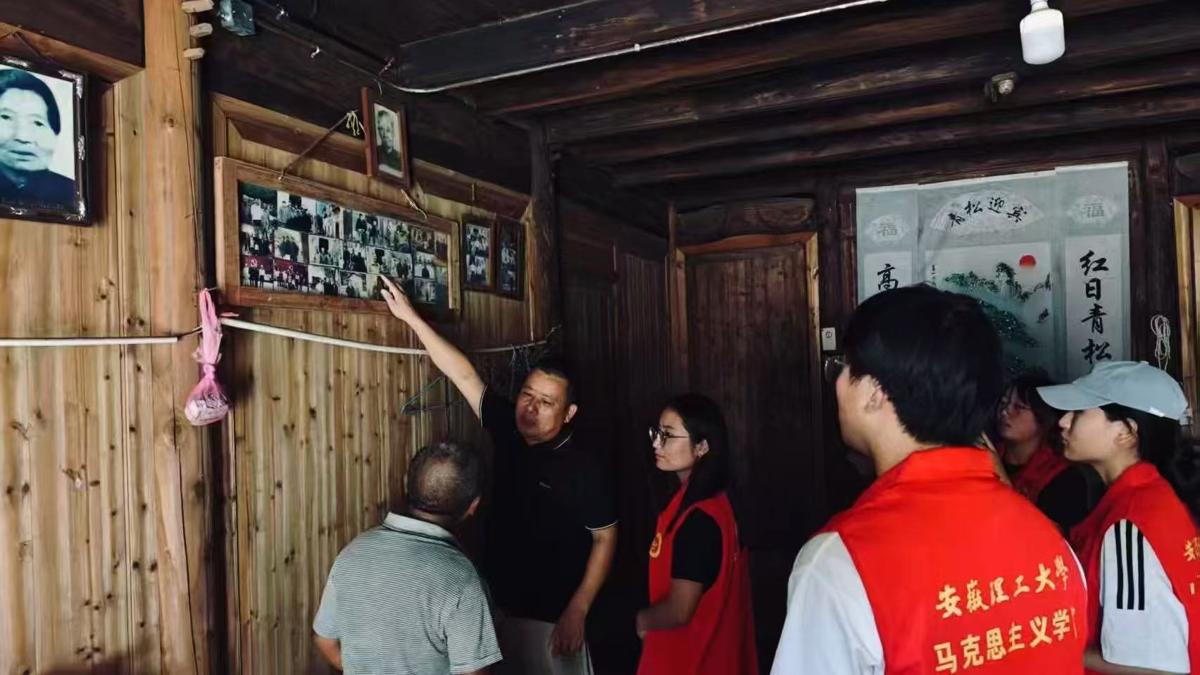 8月8日上午,队员们走进新四军司令部旧址,五合村胡书记的讲解让历史变得鲜活:“这里是当年红军的总部,艰苦岁月里,家家户户都住过红军战士,门板当床、稻草为被,军民鱼水情就藏在这些老故事里。”现在旧址门口的老槐树依旧葱郁,仿佛仍在诉说着红军浴血奋战、守护家园的峥嵘岁月。经过百年沧桑,杨滩人民始终坚守初心,党群一心,守护绿色家园。队员们在旧址内驻足凝视,从泛黄的史料、斑驳的墙痕中,体会到红色政权的来之不易,更深刻理解从军民同心到党群一心的红色传承和发展底色。