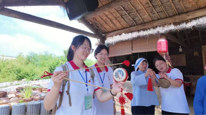 图为团队成员体验国家非遗凤阳花鼓照片张馨月供图