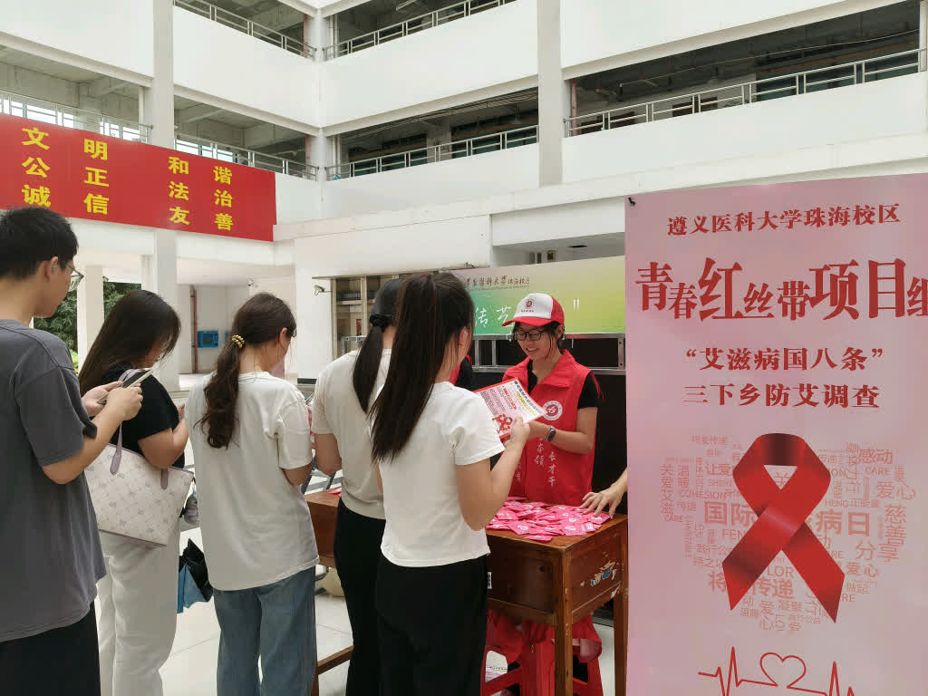 为探索珠海市大学生对于国八条的认知水平,提高校园防艾宣传工作针对性和有效性,为珠海市大学生防艾宣传工作贡献遵珠学子力量,遵义医科大学珠海校区青春红丝带项目组积极开展防艾宣传实践活动,于6月29日-7月4日在遵义医科大学珠海校区,以及7月9日 在暨南大学珠海校区开展了为期7天的专题实践与调研活动。通过主动讲解、发放宣传手册,问卷调查等形式,深度探究了珠海市内不同专业、不同年级的大学生与国八条知晓率的相关性。实践期间,组员不仅向大学生普及了国八条、艾滋病防治知识等内容,更通过一些趣味讲解和小游戏,引导大家科学认识艾滋病,筑牢青春健康防线。