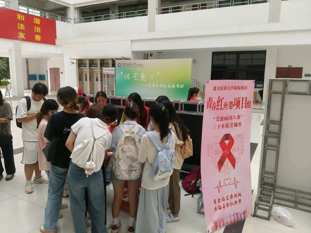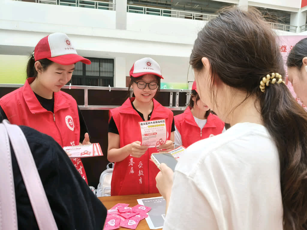 6月29日上午,青春红丝带项目组选定遵义医科大学珠海校区图书馆、综合楼、教学楼出入口等人流密集区域,搭建防艾宣传展台。在简短的工作对接后,一部分组员主动去寻找同学参与调查问卷的填写,另一部分组员在展台向同学们发放宣传手册,并进行国八条解读,向同学们普及艾滋病防治相关知识。