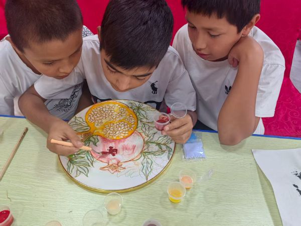 掐丝珐琅课堂上,团队志愿者溯源紫禁城的流光岁月,将景泰蓝的百年荣光娓娓道来,为当地小朋友演示“掐丝弯作游龙纹,点蓝晕染青鸾羽,淋胶凝驻流光影”的核心工艺,孩子们的眼眸被绚烂釉彩点亮,在团队志愿者的指导下,感受到了掐丝珐琅的艺术魅力。