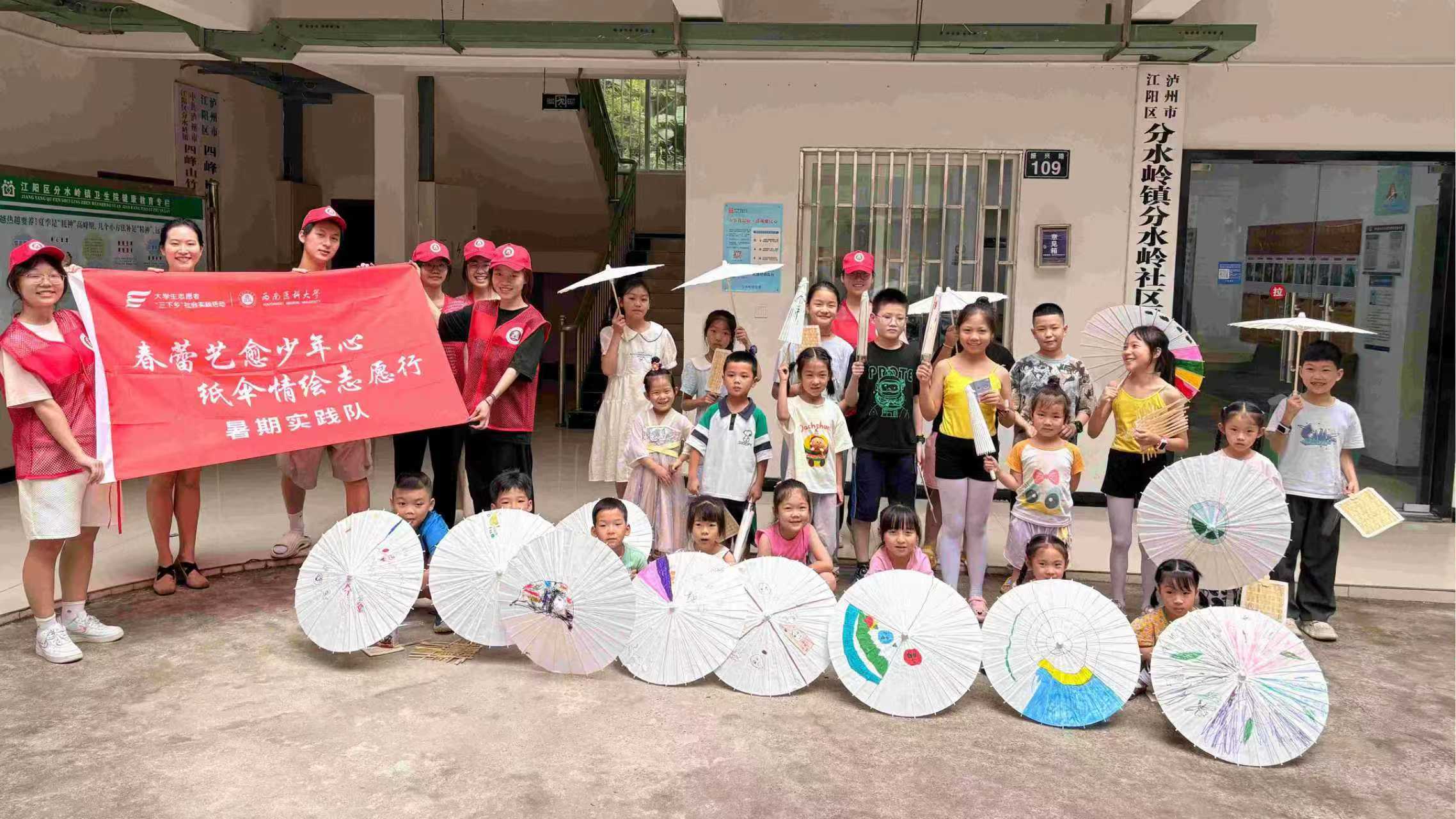 7月7日至14日,西南医科大学“春蕾艺愈少年心,纸伞情绘志愿行”暑期社会实践团队先后在四川省泸州市江阳区分水岭镇、龙马潭区龙祥社区和大驿坝社区,开展了为期8天的社会实践活动。团队聚焦儿童艺术心理疗愈,以国家级非遗油纸伞文化为载体,构建“伞绘心语”情绪认知体系,为当地少年儿童带来了一场兼具文化浸润与心灵关怀的实践课。