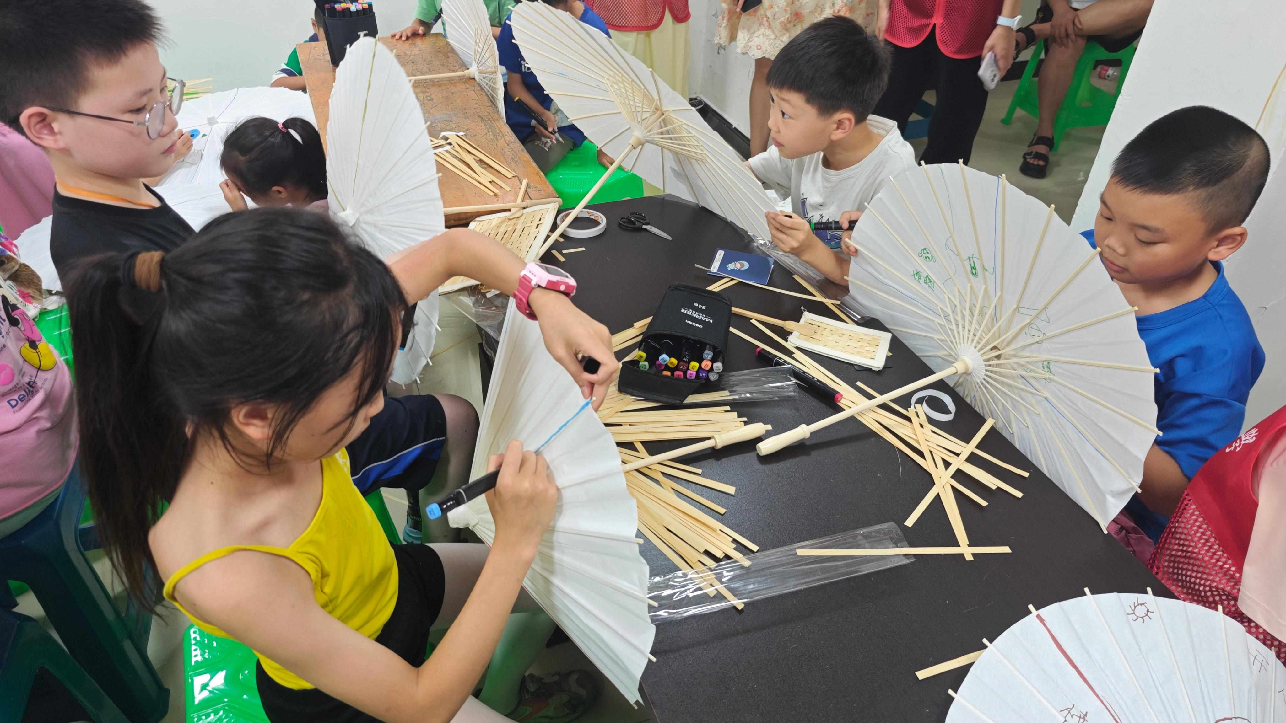 活动中,志愿者带领孩子们进行了“触竹・识韧”“伞面涂鸦”等深度体验,引导孩子们触摸纹路、感知韧性,共同编织竹片扇子并自由作画,帮助儿童在油纸伞上绘画自己关于油纸伞的故事、场景,分享油纸伞带来的感受、亲身经历等,引导儿童识别和表达多种情绪,进而学会接纳管理情绪。通过非遗深度体验激活当地儿童文化记忆,唤醒油纸伞与情绪认知的联结。