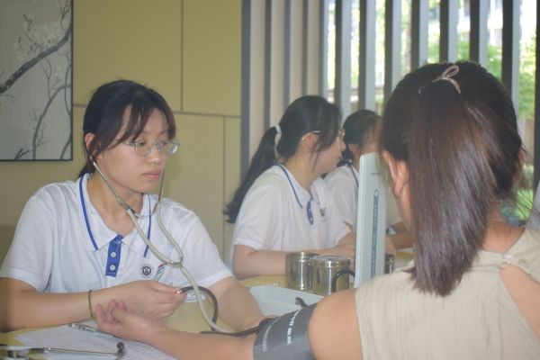 岐黄仁术解民忧:专业服务零距离实践团甫一抵达,居民们便带着期待聚拢而来。白大褂虽薄,却承载着沉甸甸的信任。血压计袖带温柔缠绕臂膀,血糖仪精准读取数值,志愿者眼神专注,指尖稳定,每一次操作都渗透着对生命的严谨与尊重。推拿区域更是“一席难求”。来自中医、中西医临床医学及康复治疗等专业的学生们,指间流淌着苦练而成的力道与技巧。在少荃府社区,年近古稀的张大爷长久困扰于肩颈酸痛,经志愿者一番耐心细致的推拿后,紧锁的眉头终于舒展:“这手法真地道!感觉这硬邦邦的肩膀松快多了,像卸下了块石头!”那舒缓的喟叹,是专业技能最真实的回响,更是中医药“简、便、验、廉”优势在百姓家门口的生动印证。