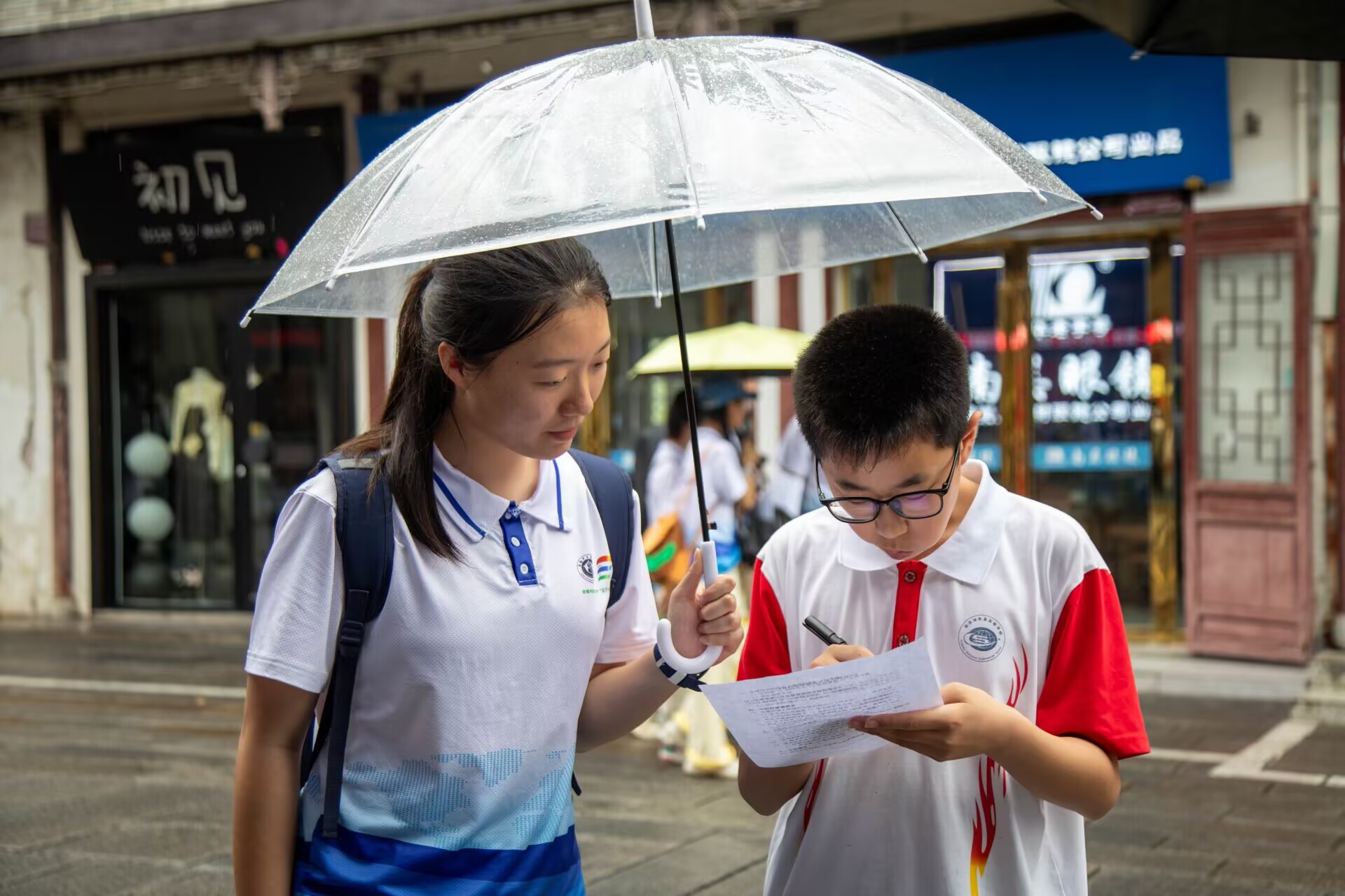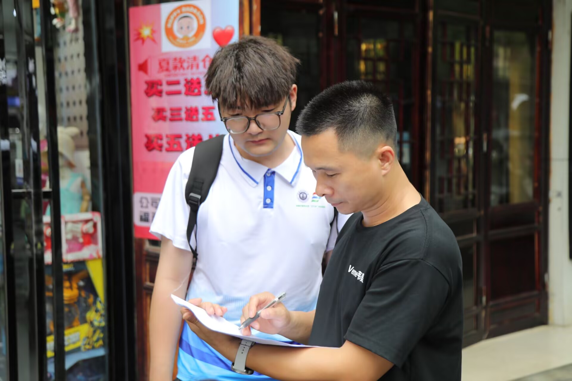图为实践团成员向社区居民内青少年群体进行调研问卷的场景。易玉昊摄