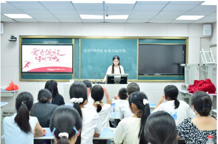 面对“双减”政策对学科辅导的限制,实践队与校方座谈后调整策略,将重心转向价值观引导和心理关怀。7月15日,一场以“规范使用网络,拒绝沉迷成瘾”为主题的互动式团课在樊村中学录播室展开。