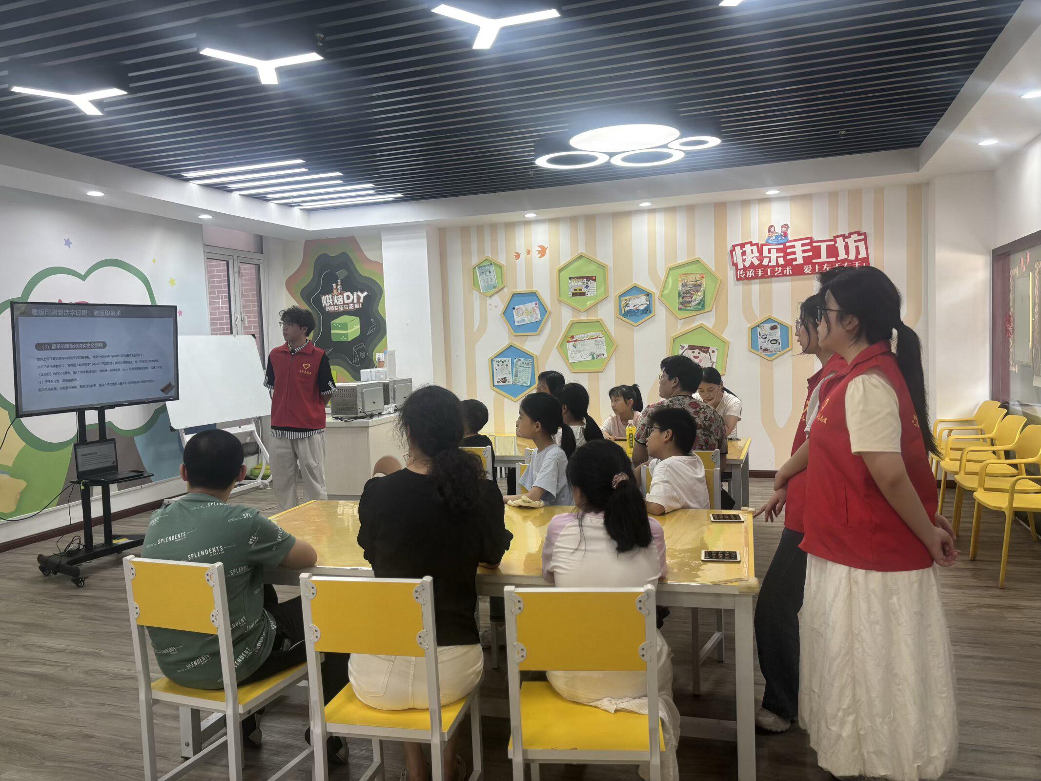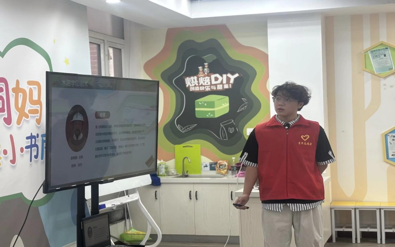 志愿者们通过精心制作的PPT,将活字印刷术的历史脉络娓娓道来。从东汉蔡伦改进造纸术,到隋唐时期的雕版印刷,再到北宋毕昇发明泥活字印刷术,每一个时间节点都被转化为孩子们能理解的故事:“就像我们玩积木一样,毕昇爷爷把每个字做成一个小‘积木’,想要印什么文章,就把这些‘字积木’拼起来,用完了还能拆下来下次再用,是不是很聪明?”