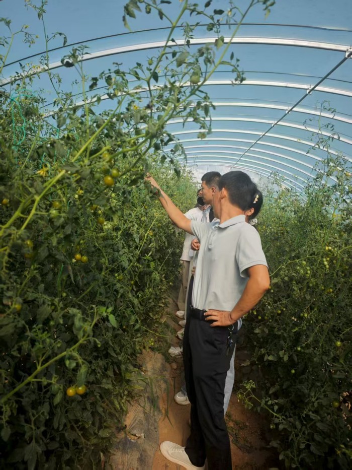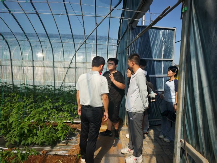 随后,在公司负责人带领下,实践队前往洛南放心菜种植基地,在田间地头参与牛粪有机肥翻堆作业,详细记录发酵参数与操作要点,与基地技术人员探讨有机肥对土壤改良的具体作用。在圣女果种植区,队员们精准记录株高、叶片数等生长数据,并与农技专家座谈,深入学习番茄抗病种植技术与病虫害防治经验。