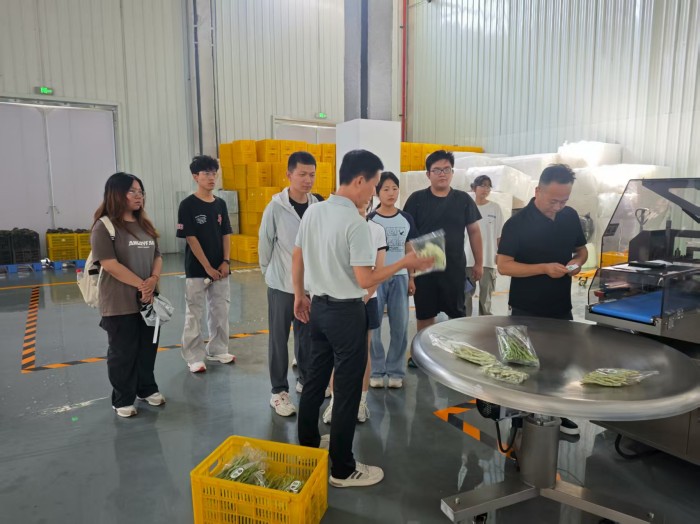 实践团队首站走进洛南县康胜润农业科技有限公司,在企业技术人员引导下,系统学习“1+6”产业链布局,通过案例解析掌握当地农业产业架构与发展模式。队员们深度参与“一菜一码”追溯系统实操,熟练掌握信息录入、全程追踪等关键流程;随后进入冷链车间跟岗,熟悉预冷、分拣、仓储全流程,并参观安全质检中心与仓储配送中心,直观感受科技在农产品质量管控、产后处理环节的应用。团队向企业展示了自主搭建的系统演示视频,围绕功能优化、场景适配等与技术人员深入交流,收集到诸多建设性反馈。