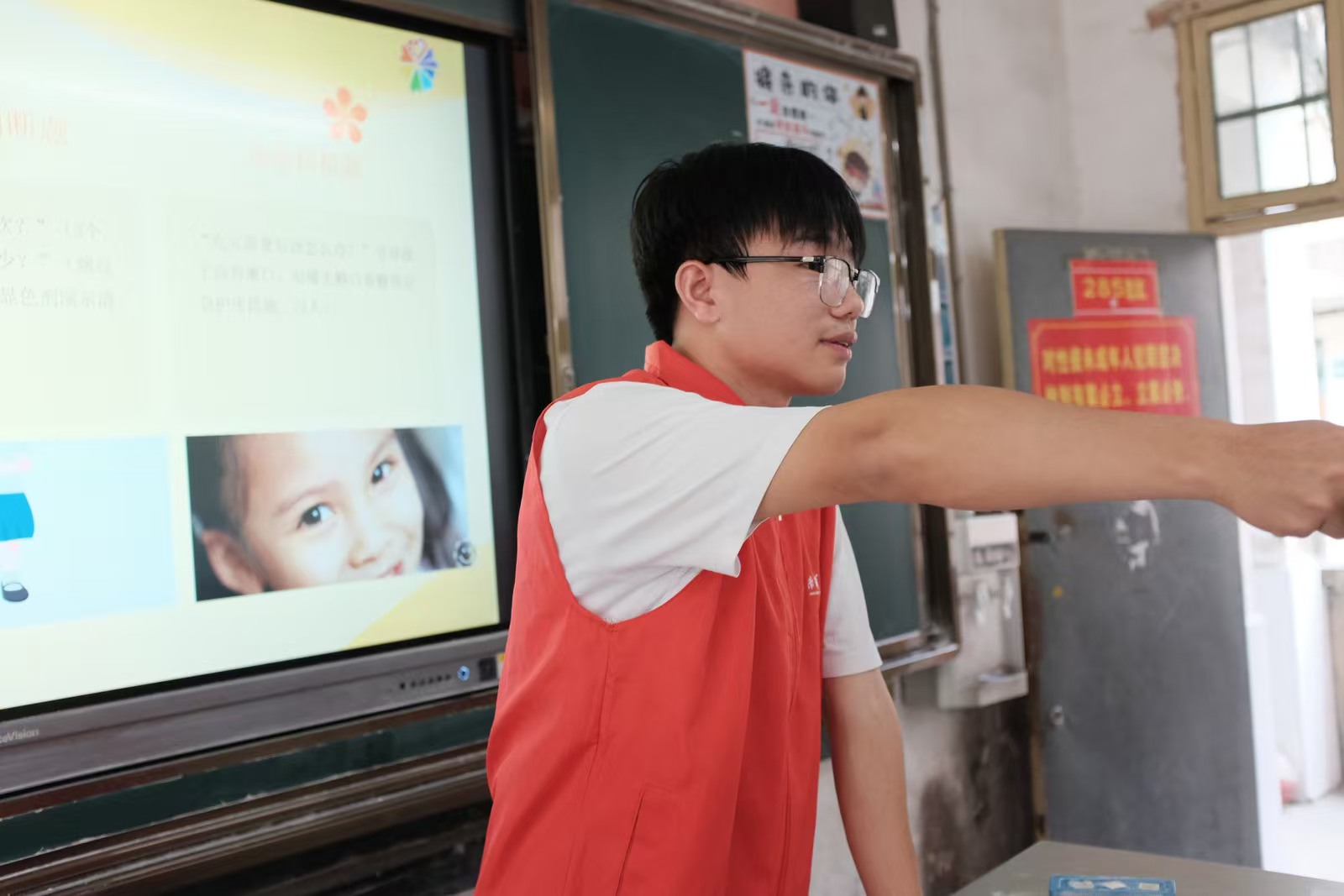 结营前一天,我们想办个小演出。天刚蒙蒙亮,风里带着湿意,我们踩着露水去布置场地。六点多的风掠过低矮的屋檐,孩子们陆陆续续来了,脚步声轻悄悄踩在校园的水泥地上,带着对这场演出的稀罕。朝阳漫过教学楼时,我们坐在最后排,看前面挤挤挨挨的四十多个小身影。先让孩子们表演准备的节目,风把他们的歌声送得稳稳的,我们跟着拍手;接着我们展示这些天拍的照片,有上牙齿健康课的认真模样、有在学生家厨房围坐吃饭的热闹场景,孩子们指着照片直喊“这是我”,小手举得老高——那些就着手机查资料、在宿舍熬夜改教案的夜晚,早把对这些孩子的在意,揉进了风里。我忽然懂了“风的方向”:不是往远处吹,是他们心里对知识的盼,是我们踏进校园时的那股热劲。