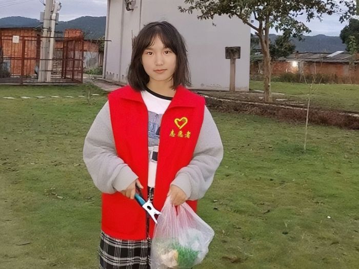 图为实践团成员张瑞莲在社区清理草地垃圾。张瑞莲 供图
