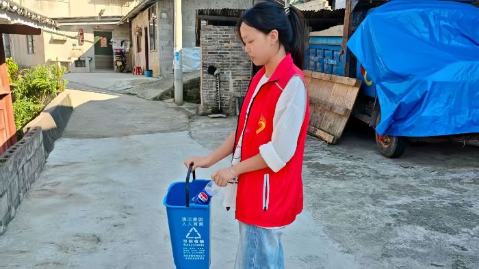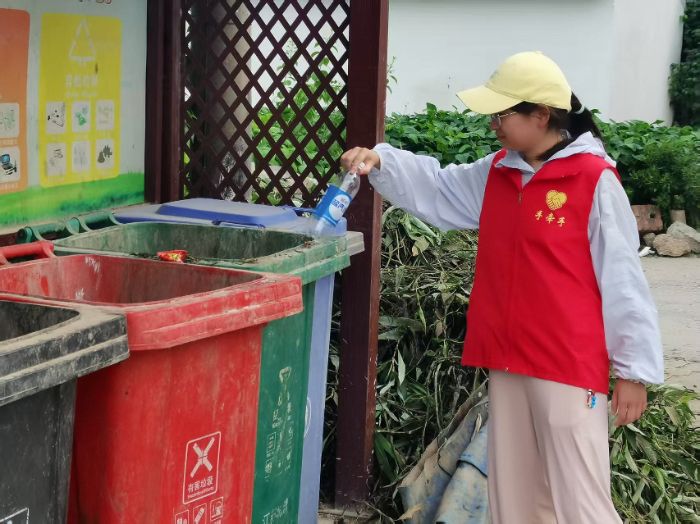 图为实践团成员杨彩绫手持可回收物垃圾桶,分类投放塑料瓶。杨彩绫 供图