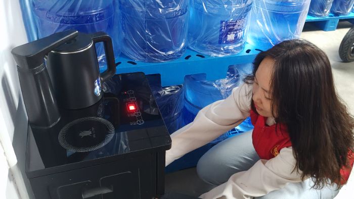 图为实践团成员晏文灵在社区帮忙换水。晏文灵 供图