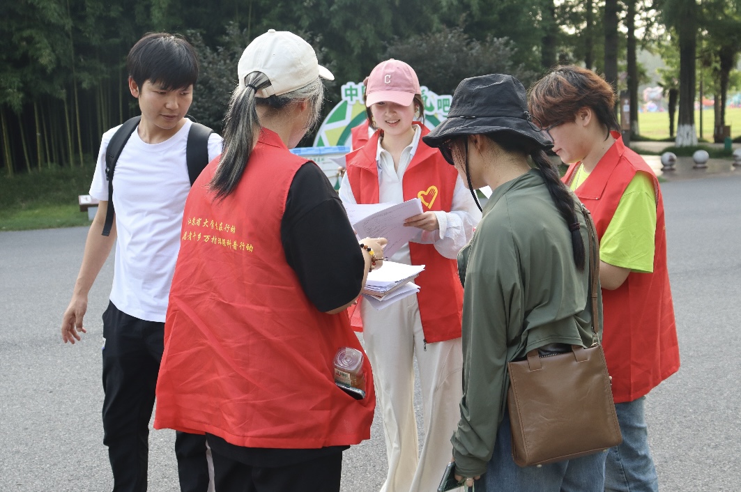 图为团队成员向游客发放调查问卷并科普。赵伟程 供图