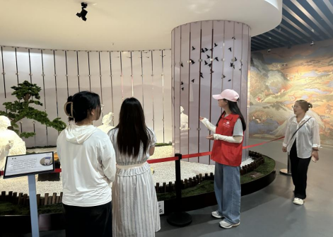 榴园博物馆,承载着当地历史与文化。团队成员以“讲好榴园故事”为目标,深入了解展品背后的“光阴故事”,担任“临时讲解员”,用生动语言为游客导览:从古老的陶器、青铜器上栩栩如生的石榴纹饰,到现代艺术品中对石榴形象的创新演绎,每一件展品都承载着历史的记忆。借助网络媒体的生动展示,大家仿佛穿越时空,看到石榴从西域传入中国,在淮北落地生根、蓬勃发展的历程。