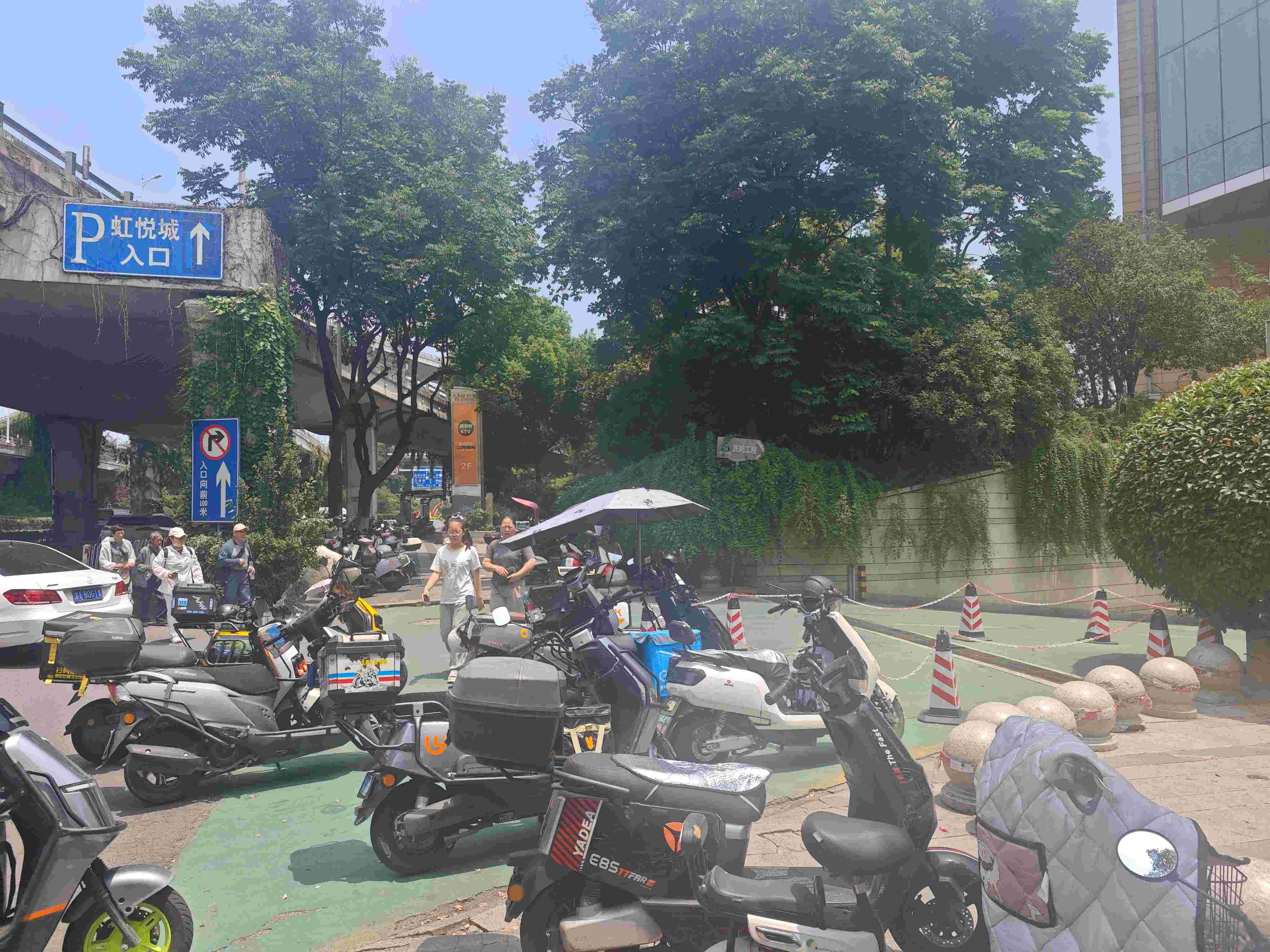 (图为雨花台区某商场门口停放的各平台外卖员的车)