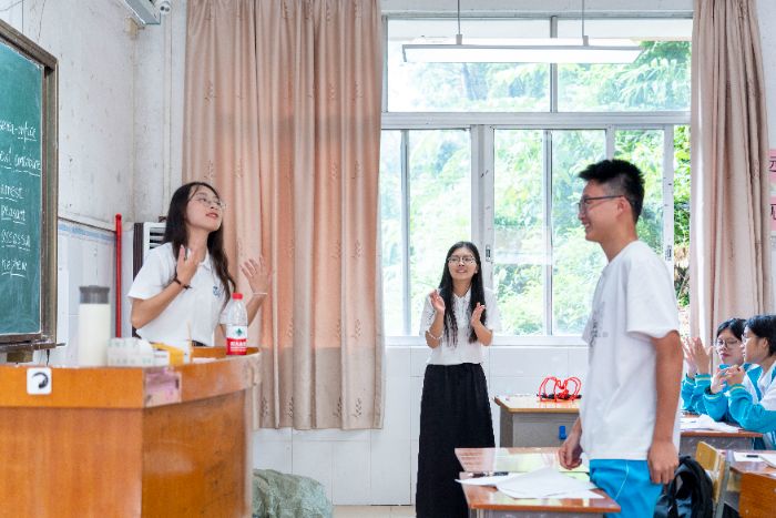 为深入贯彻落实广东省“百千万工程”和“双百行动”部署,华南师范大学外国语言文化学院“博英江声”实践团连续两年赴“双百行动”重点帮扶地区肇庆市封开县开展暑期“三下乡”实践活动。面对当地高中生普遍存在的英语基础薄弱、学习兴趣不足等问题,实践团立足学科特色,创新采用“英语戏剧教学”模式,以“敢”为精神内核,通过沉浸式、互动性强的课堂设计,帮助江口中学准高二学生突破语言障碍,实现从“怯于开口”到“自信表达”的蜕变。