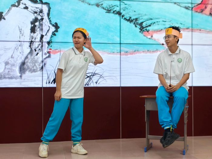 针对乡村学生英语学习的“畏难情绪”,团队精选《封神演义》中“比干挖心”“姜太公钓鱼”等经典片段,通过文本品读、角色代入到舞台呈现的阶梯式教学,将语言学习自然融入戏剧实践。
