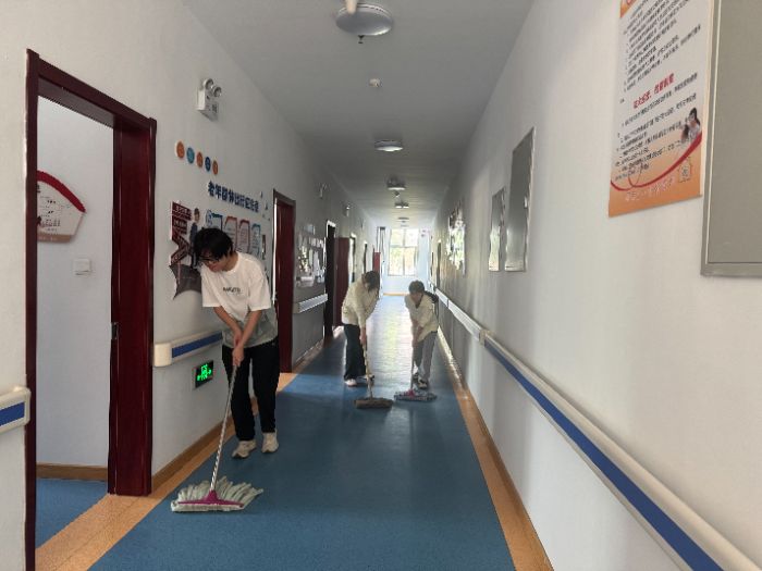 实践活动期间,实践团成员对于老人们生活环境的卫生情况也十分重视,在队长的安排下迅速地开始了卫生清扫工作。分工合作,默契配合,有的负责清扫老人理发后的头发,有的负责拖地。实践团成员们不放过死角,确保养老院的整洁与卫生,为老人创造一个整洁舒适的生活环境。