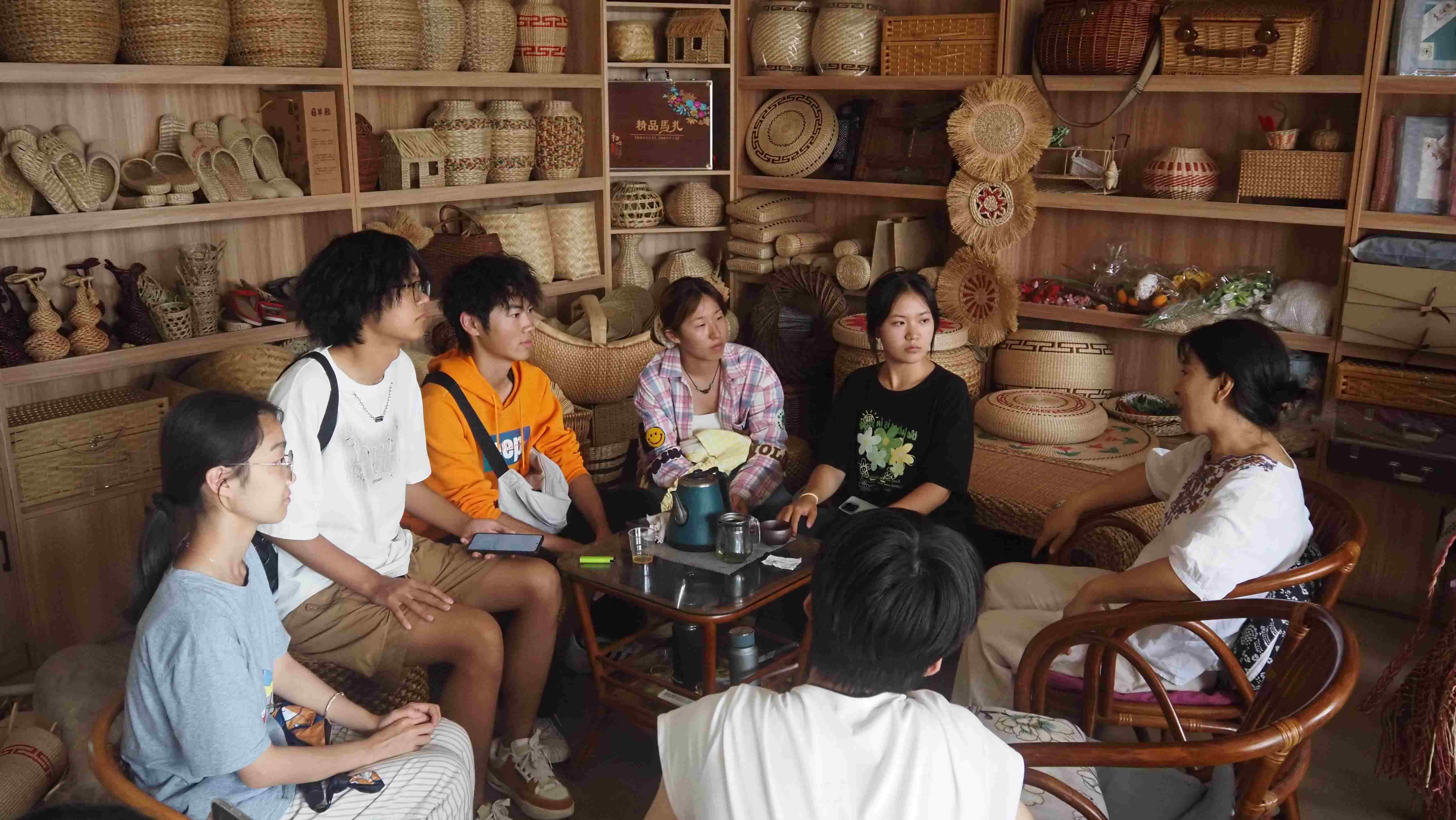 图1为队员向非遗传承人王贵芝女士学习柳编技艺