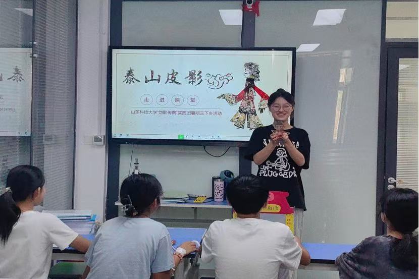 图为实践团成员进行“泰山皮影走进课堂”讲解展示。曹洁 供图