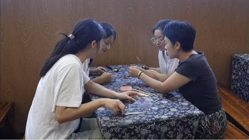 在传习馆师傅的耐心指导下,实践团成员们拿起刻刀亲身体验。从皮料裁剪到部件雕刻,成员们在“稳、准、匀”的运刀要求下,从笨拙到渐入佳境。刻刀划过材料的“沙沙”声,不仅是对技艺的粗浅触碰,更是对“匠心”二字的深刻体悟。