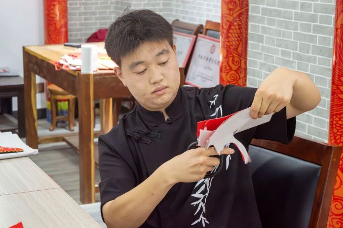 最精彩的环节当属刘老师的剪纸现场展示。只见他手持剪刀,在红纸上快速剪裁,不到五分钟,一组栩栩如生的蝴蝶便跃然纸上。翅膀纹路细腻,触须纤毫毕现,让同学们惊叹不已。在刘老师指导下,同学们也尝试剪纸创作,虽然作品粗糙,但收获满满。