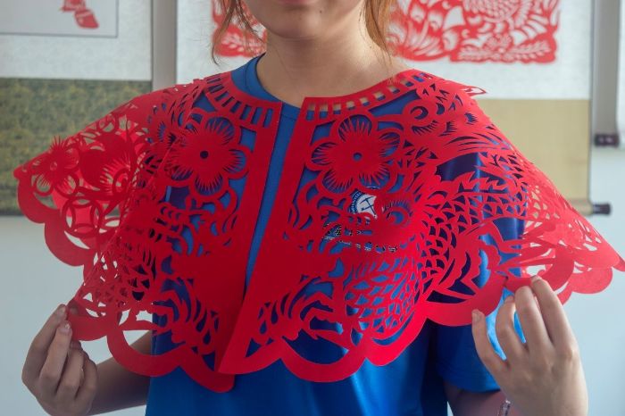 刘老师向同学们展示了珍藏的剪纸作品,包括已故剪纸大师库淑兰的代表作。这些作品构图精巧,线条流畅,让同学们叹为观止。更令人惊喜的是,团队成员有幸试穿了刘老师制作的融合剪纸元素的绒布云肩,这些创新作品展现了传统艺术的现代表达。